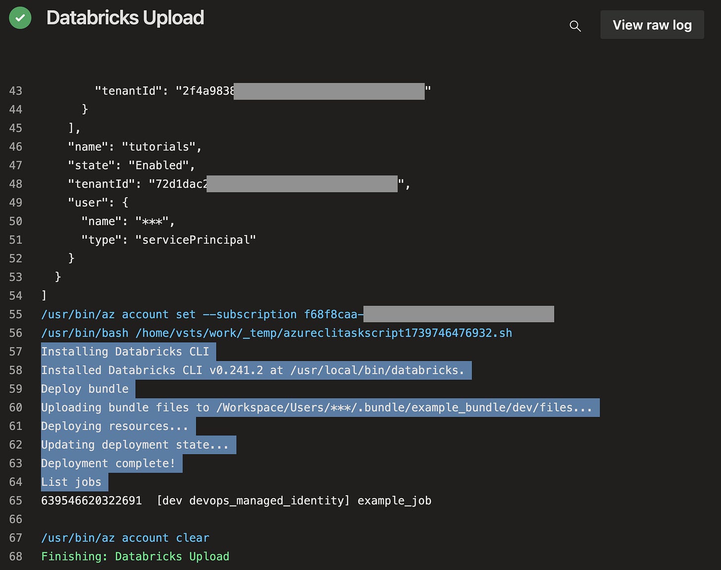 databricks jobs listThe following screenshot shows how the example pipeline above looks like after it runs. See that it deploys successfully.