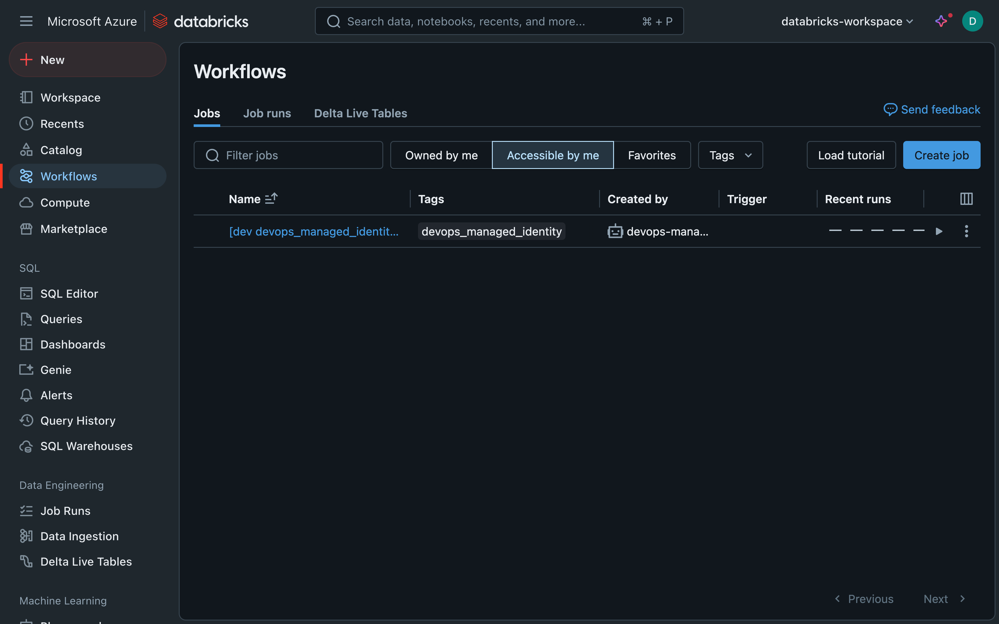 This is how the deployed job looks like in Databricks. Notice that the job is owned by the managed identity. And I actually like the cute robot icon.