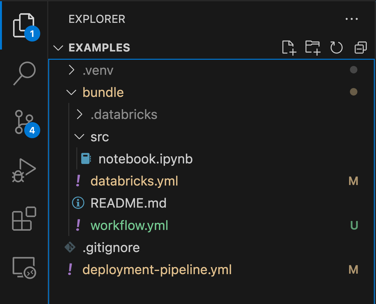 In this guide, I have a simple Databricks asset bundle project under the /bundle folder. The project has its definition in databricks.yml file and a workflow / job definition in worklow.yml file.
